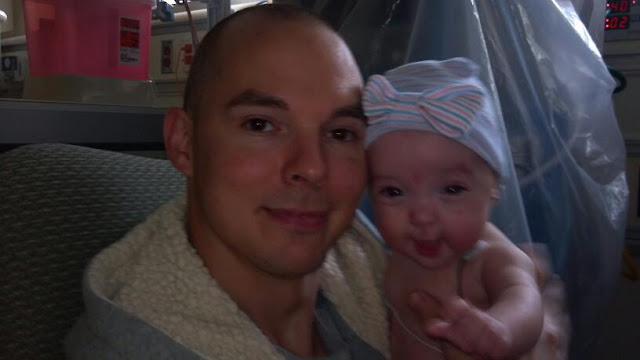 On Sunday, September 11th, I woke up to one of the girls coughing weird-I had never heard that kind of a cough before so I got up to check and see if they were alright. I put my hand on the chests to see if they were breathing like I usually do when I get up in the middle of the night for some reason- and I didn't feel Presley's chest rising. I flipped on the light and she was totally blue! I couldn't believe it-it was my worst nightmare. I quickly handed her to Travis told him to do CPR and I called 911. Travis gave her her 3 rescue breaths and she finally came to but she was wheezing and pale and still kind of blue. The ambulance got here and we went to CPMC. When we got there she was totally blue again and it took them exactly 40 minutes to get her breathing on her own again. It was awful and I hope I never have to see either one of them like that ever again. After 2 albuterol nebulizer treatments and finally a epinephrine vaporizing treatment she was OK and stable. They already had called the RT guys to come in and prepare to intubate her but at the last minute her airway opened up most likely because of the epinephrine. They told me it was RSV which is a really bad cold virus that is really bad for preemies and what they had always warned us about in the NICU before going home. I was really scared. They told us that the RSV would get worse in 2-3 days and that they may need to either give her oxygen or put her on the ventilator. Luckily, it did not progress and the doctor's were thinking that Sunday morning was probably the peak of the virus. Everyone came in and told Travis what a great job that he did and that had he not done the rescue breaths, she would not have made it. I am just now catching up on sleep since the breathing treatments contain caffeine and that makes little Miss Presley so hyper. I think I stayed up a whole 24 hours at the hospital with her that first night since Daddy was at home taking care of Kourtney. Here's a picture of Presley and her Daddy who saved her life:
